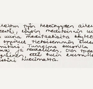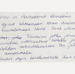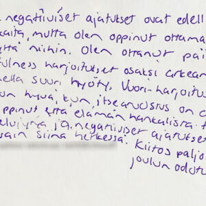 ”Olen saanut kurssin myötä rauhaa ja tasapainoa arkeen. Sain lopulta tapaamisista ja kotona tehtävistä harjoituksista enemmän irti kuin odotin. Mindfulness tulee varmasti olemaan suuri osa arkeani jatkossa. Kiitos mukavalle ohjaajalle. Itselleni tuli tunne, että tapaamisissa sai olla täysin sitä, mitä on. :)”