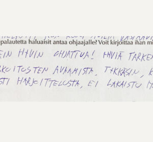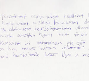 "Harjoitukset olivat usein mielessä ns. aktiivisen harjoittamisen ulkopuolellakin ja osa niistä soveltui hyvin esim. töissä tehtäväksi. Kurssista jäi semmoinen olo, että näitä harjoituksia on kiva tehdä kurssin jälkeenkin ja on ennenkaikkea halu harjoitella lisää. Hyvä ja innostava opettaja.”