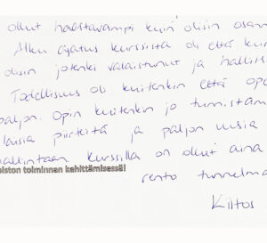 ”Alku ajatus kurssista oli että kurssin lopussa olisin jotenki valaistunut ja hallitsen stressini jo. Todellisuus oli kuitenkin, että opeteltavaa riittää ja paljon. Opin kuitenkin tunnistamaan itsessäni erilaisia piirteitä ja paljon uusia tekniikoita stressin hallintaan. Kurssilla on ollut aina kiva ja rento tunnelma. Kiitos!!”