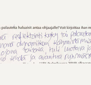 ”Hyvä reflektointikyky ja palauttamistaito. Ryhmädynamiikan käynnistämisessä ilmapiirin luojana taitava, tuli luottava ja turvallinen olo tehdä ja avautua ryhmässä.”