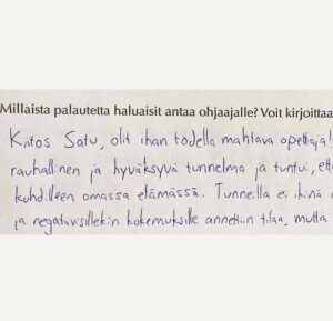 ”Tunneilla oli aina rauhallinen ja hyväksyvä tunnelma ja tuntui, että neuvot osuivat aina kohdalleen omassa elämässä. Tunneilla ei ikinä odotettu täydellisyyttä ja negatiivisillekin kokemuksille annettiin tilaa, mutta silti aina kannustettiin parhaimpaansa.”
